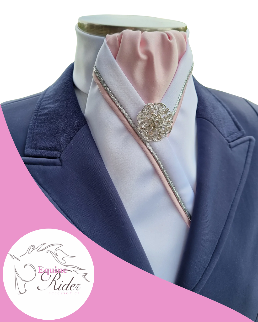 White satin with pale pink centre, silver & pink piping and silver brooch