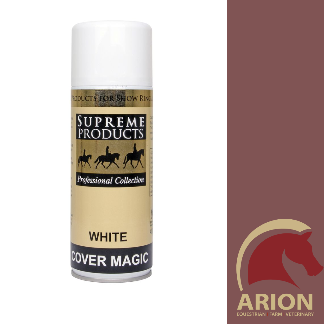 Supreme Products Cover Magic White can be used to cover over marks and scars as well as to whiten socks and cover over last minute stains. Spray from a distance of approx. 10 inches through the tail to cover stains and brush with a soft brush to disperse.